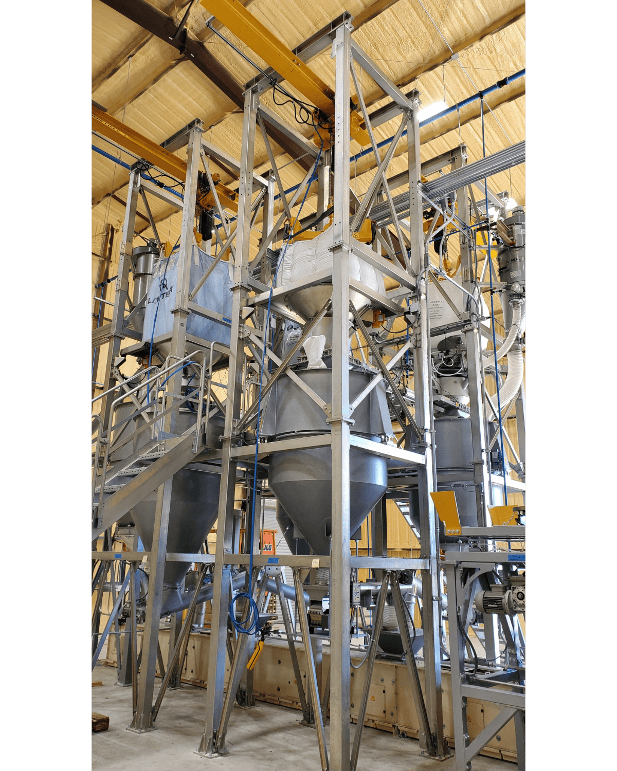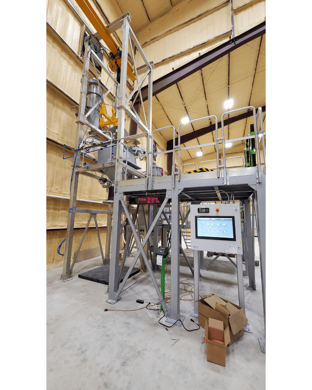 Below are images of a newly installed turnkey system for a Thermo Paint Manufacturer located in Texas, USA. This state-of-the-art facility is designed to optimize workflows and enhance efficiency across all levels of ingredient handling, dosing, conveying, batching, mixing, bagging, palletizing, and stretch hood operations.
