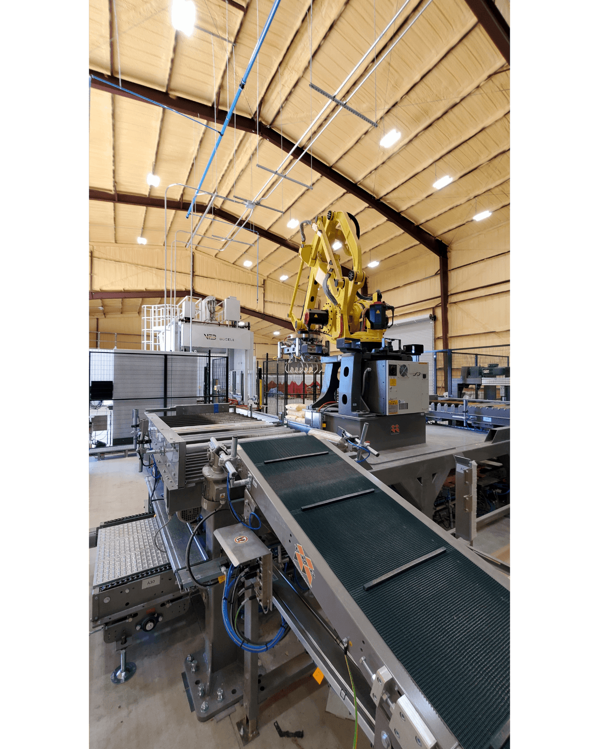 · Dual Line MIXFLEXBOT Robot Palletizing system with end of line Stretch Hood system for Pallet Stabilization and Product Protection.